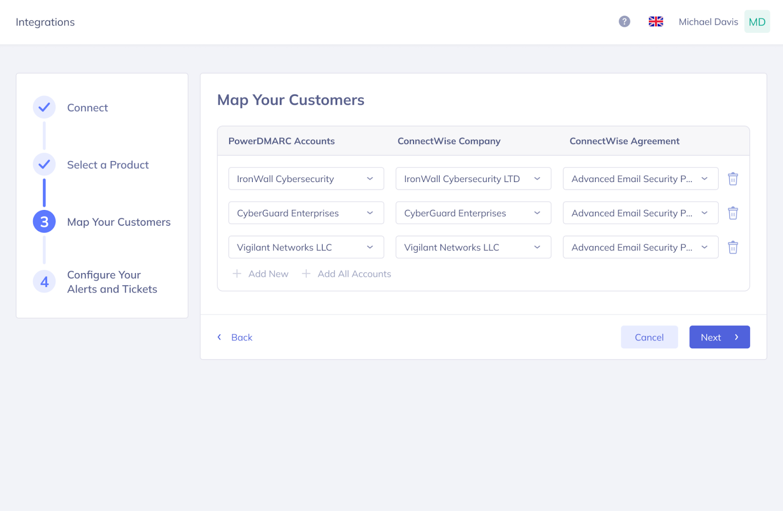 In the second column, you can choose which ConnectWise company you want to associate with each PowerDMARC account.