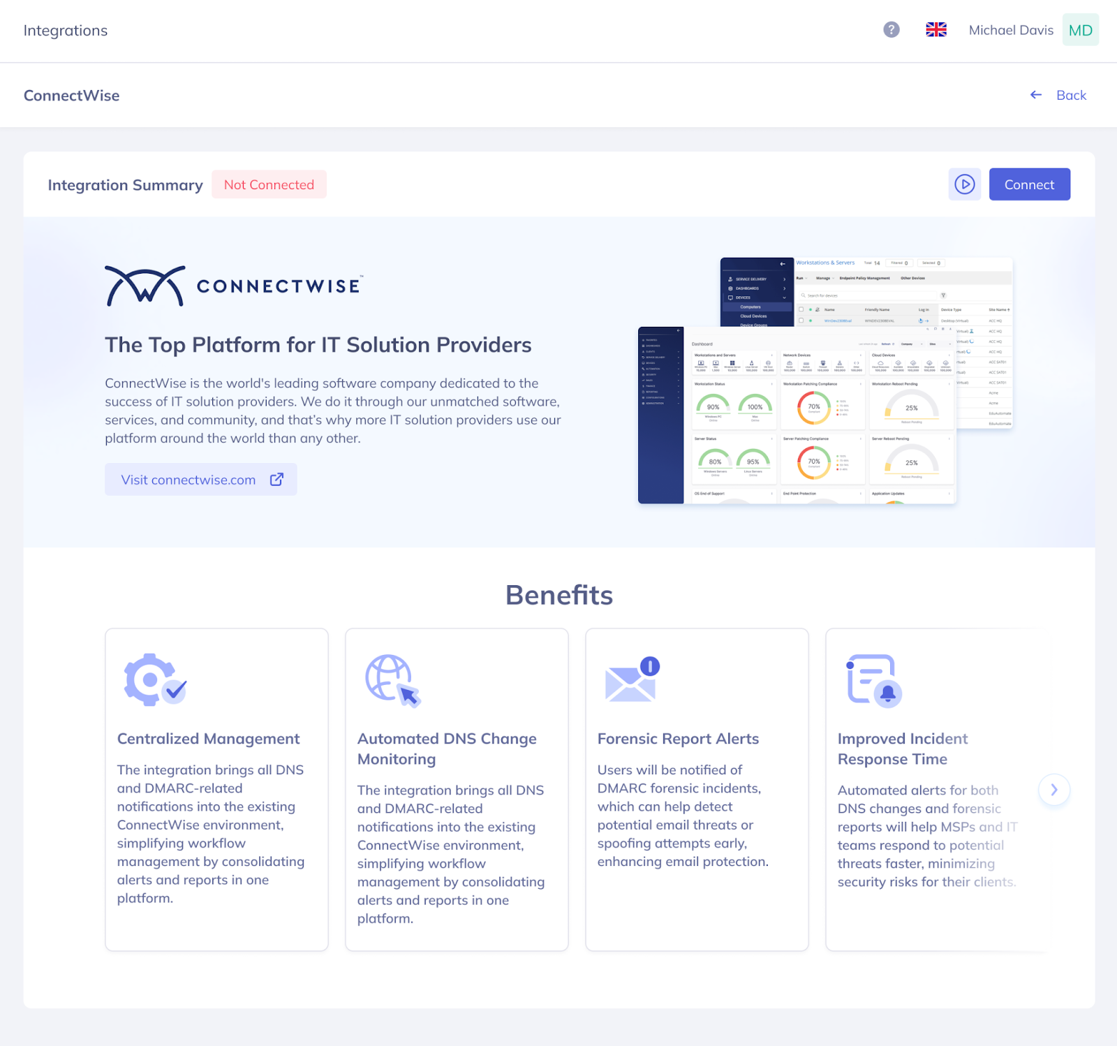 2. On the Integrations page, click "Learn More" on the "ConnectWise" card.